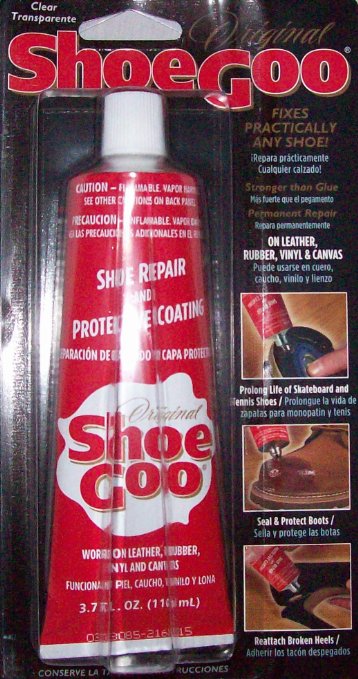 Acheté dans un tube, cette pâte molle est appliquée sur la zone affaiblie de la chaussure avec un doigt humide ou avec un glaçon (il lissant la pâte et l’empêche de coller). Après quelques heures d’attente (24 si possible), le ShoeGoo s’est durci. Avec une consistance souple et relativement élastique, le ShoeGoo est brillant et s’accroche lorsque vous grattez la chaussure contre la poignée.